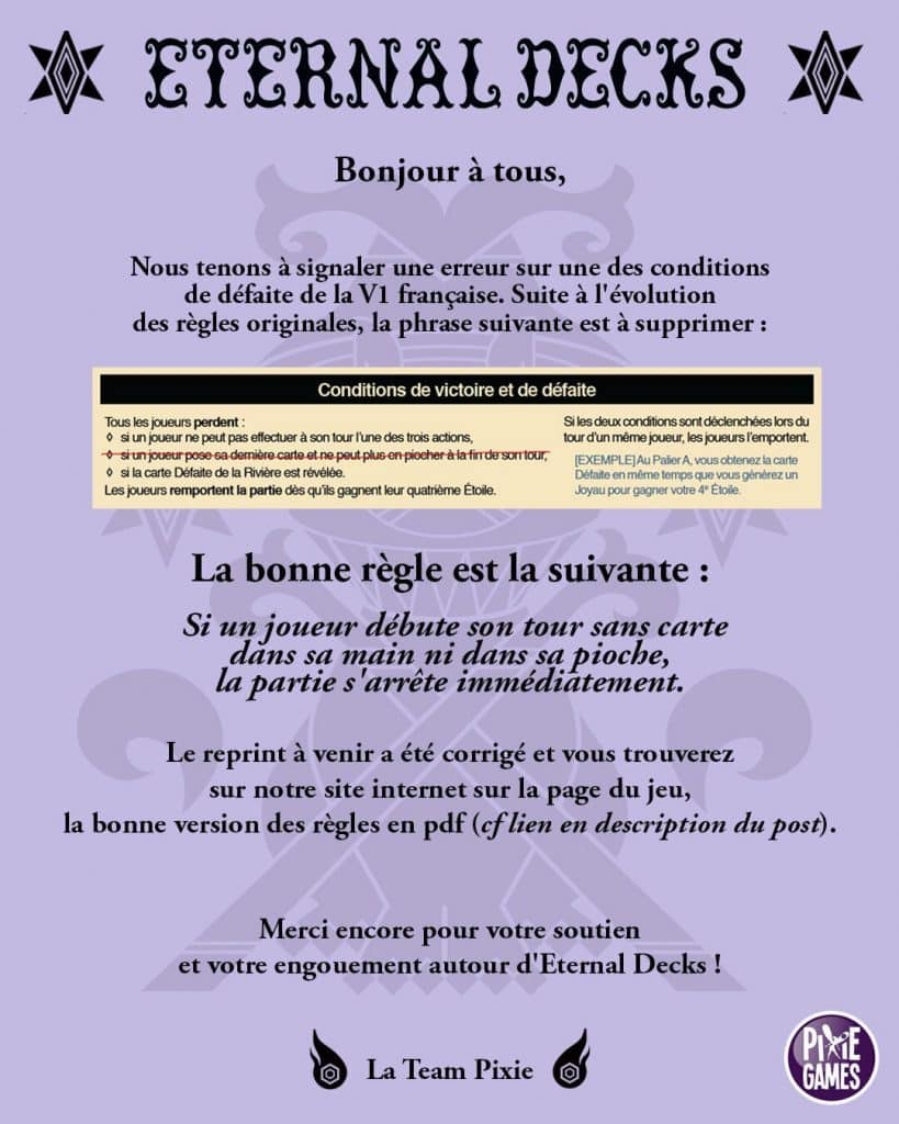 Le correctif apporte une clarification : la partie se termine si, à son tour, un joueur commence sans carte dans sa main ni dans sa pioche.