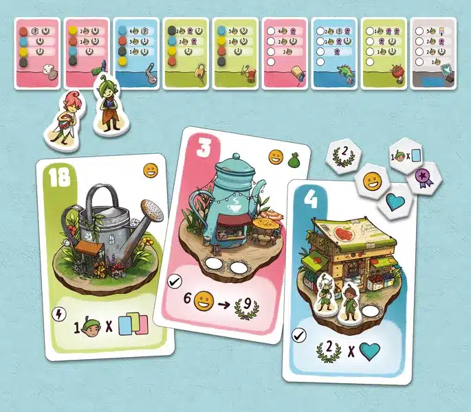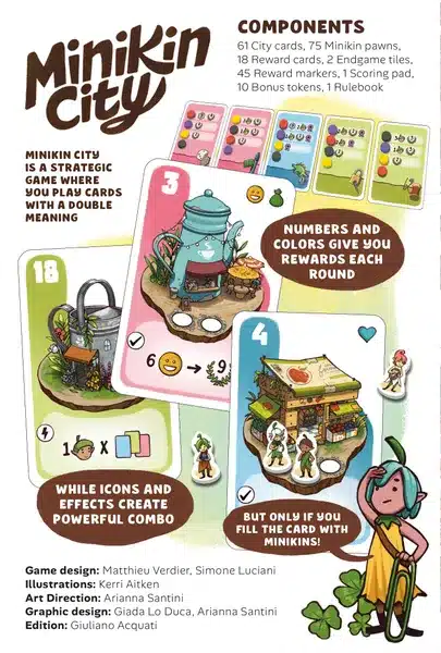Dans Minikin City, chaque carte jouée possède une double lecture : ses couleurs et valeurs déterminent des récompenses immédiates, tandis que ses icônes et effets rapporteront des points en fin de partie… à condition d’y placer suffisamment de Minikins. Les joueurs devront ainsi jongler entre gains à court terme et construction patiente de leur moteur de score.