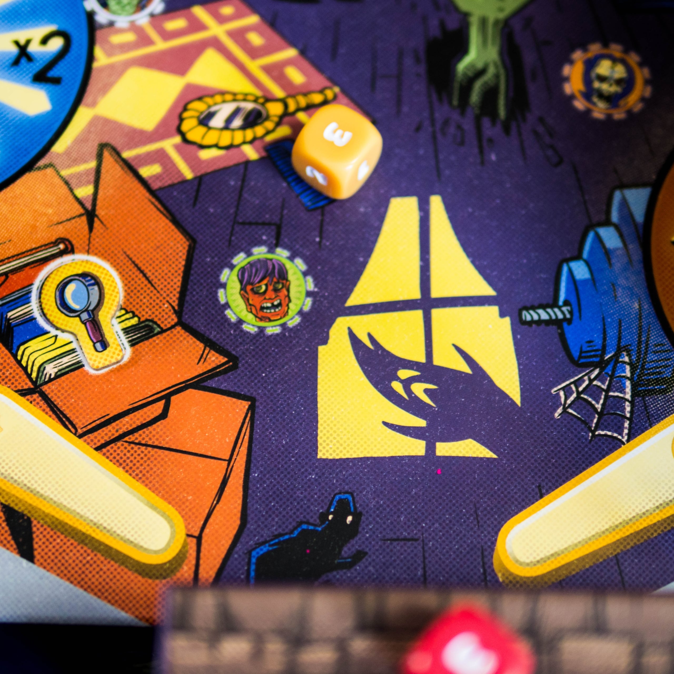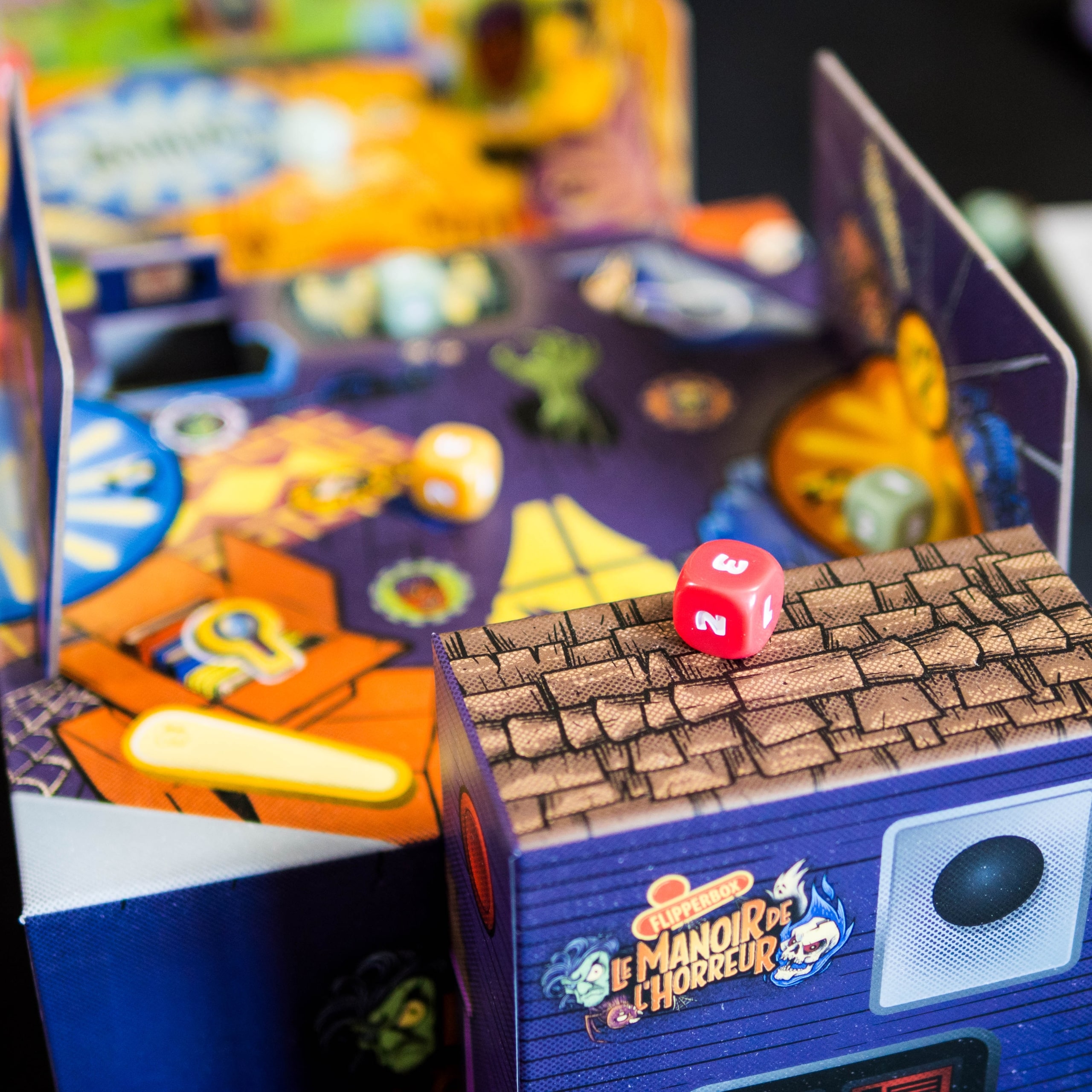 “Boxtop Pinball: Haunted House” is a game of skill for 2 to 4 players , suitable for ages 6 and up , for quick games lasting around 15 minutes . The objective is to score the most points by flicking your dice to throw them into a 3-level pinball box representing a haunted mansion.