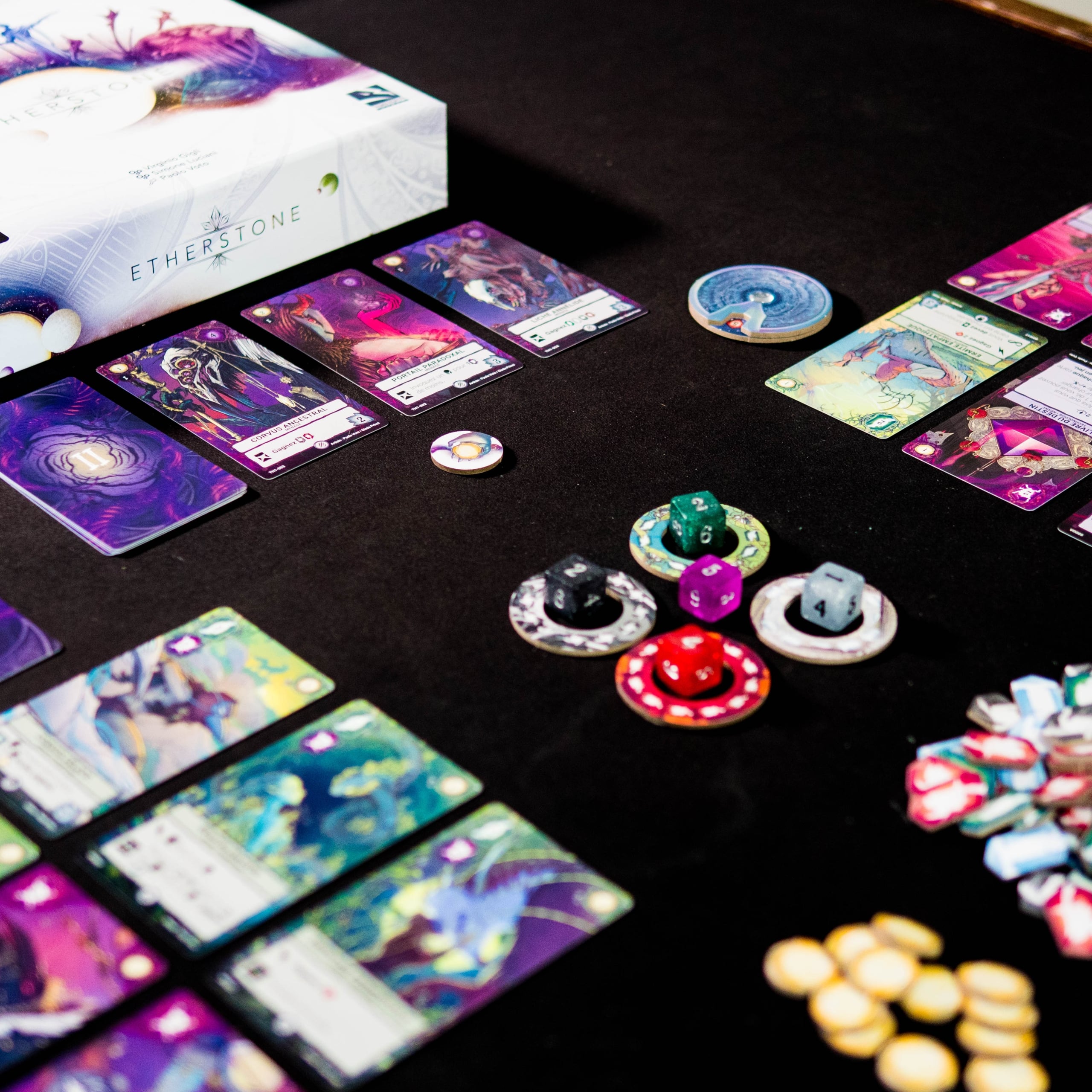 In short, Etherstone is an intense combo game where every decision, from the initial draft to the tactical choice of dice, shapes your strategy to dominate the game. It’s a must-have for fans of Res Arcana who appreciate its unique visual style.