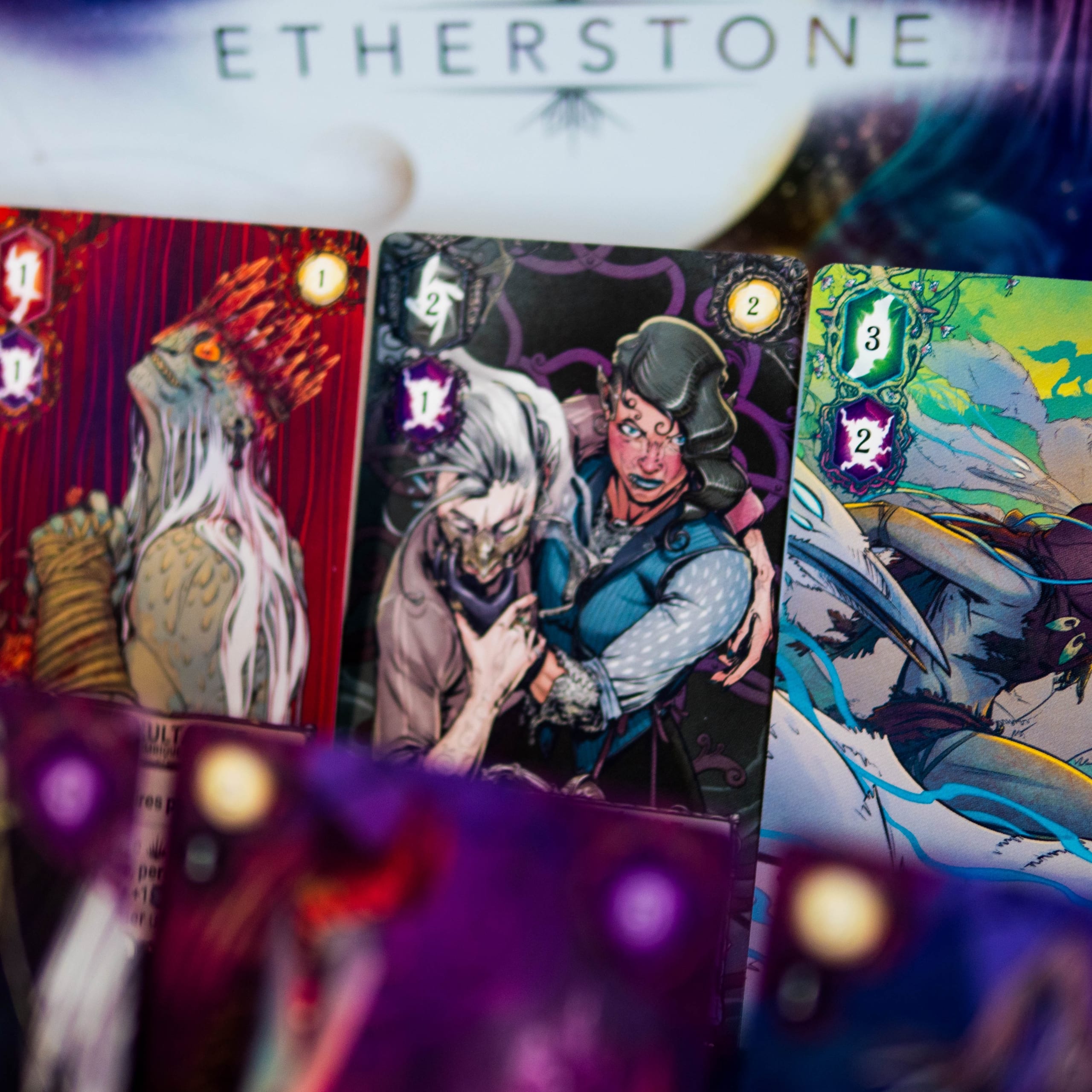 Etherstone is a card game for 2 to 4 players. On the forgotten planet of Nobura, ravaged by the corrupting Purple Void, you play an ambitious faction leader who collects Etherstones via dice drafting to summon Entities and defeat common Threats.