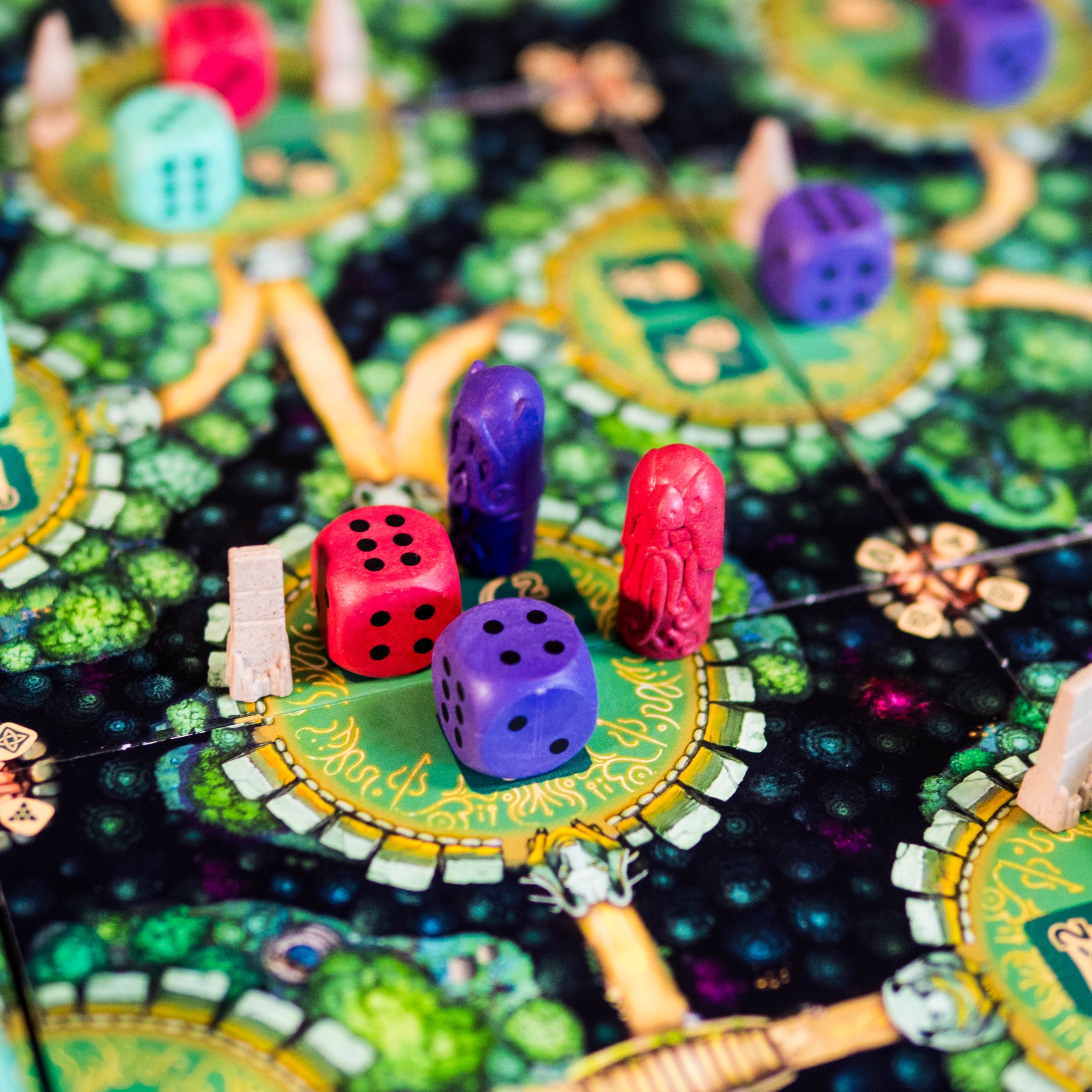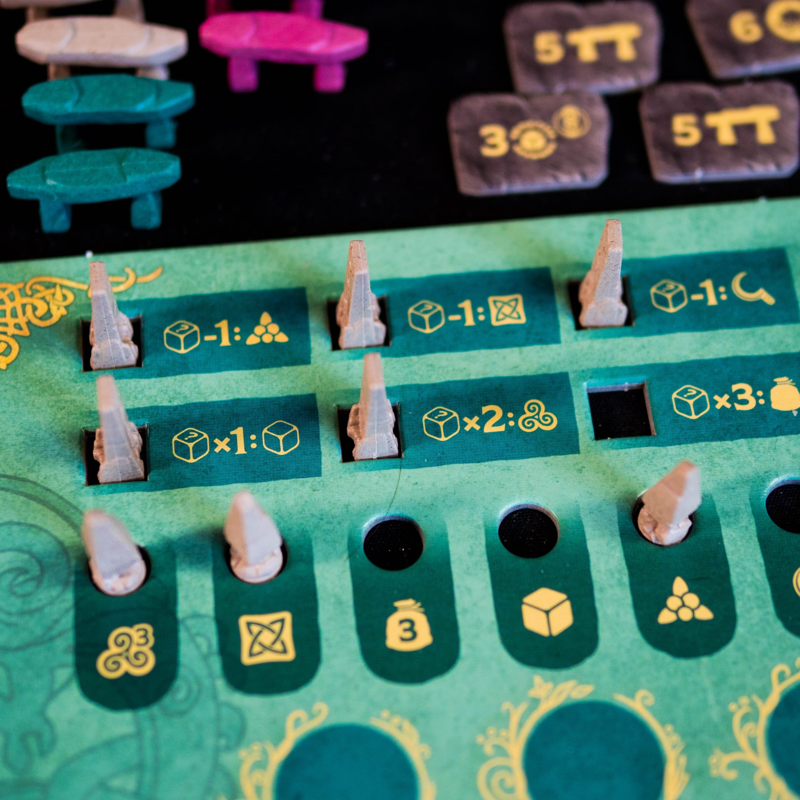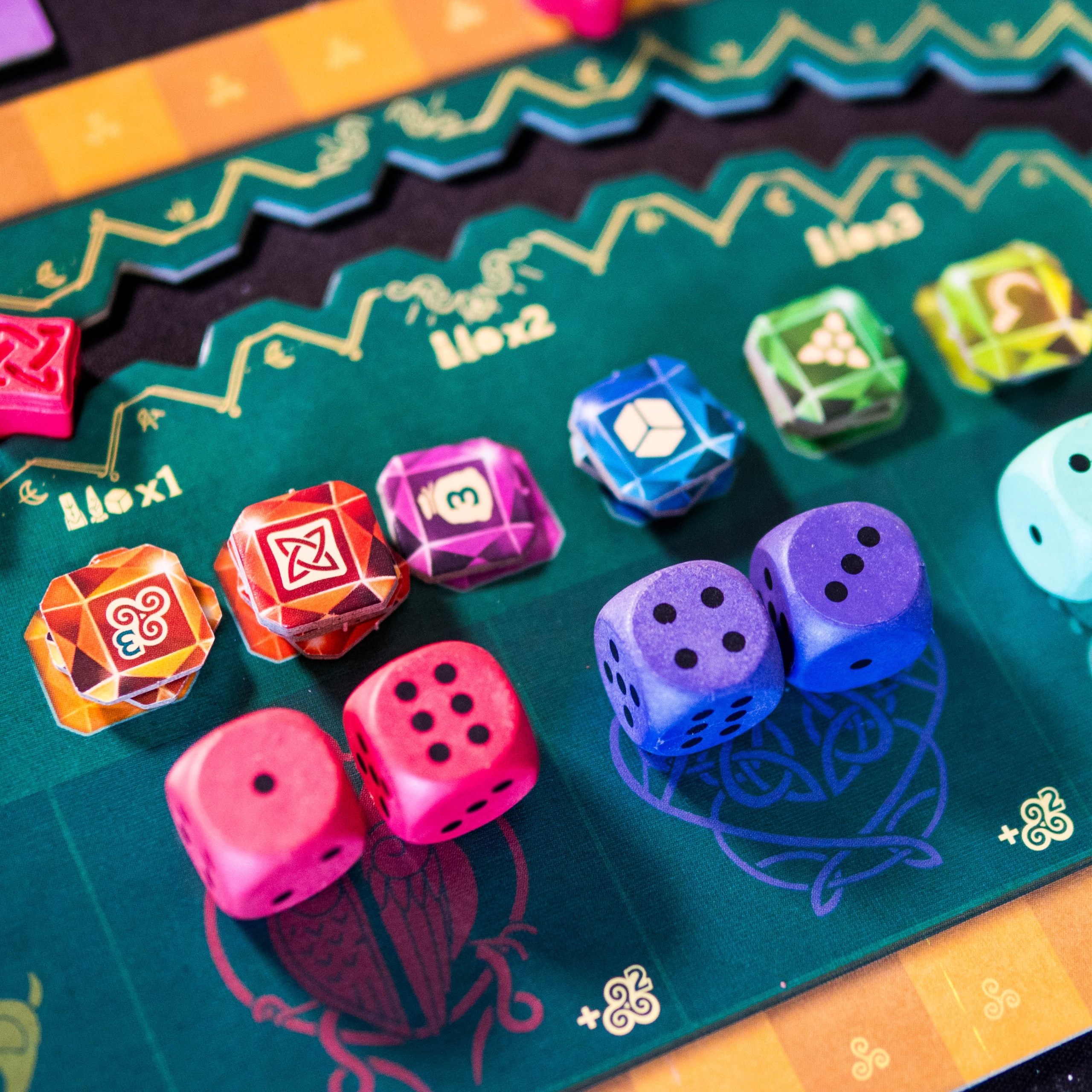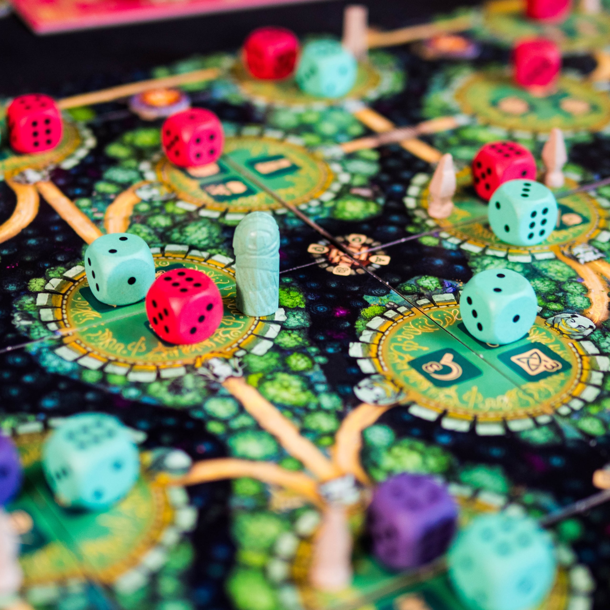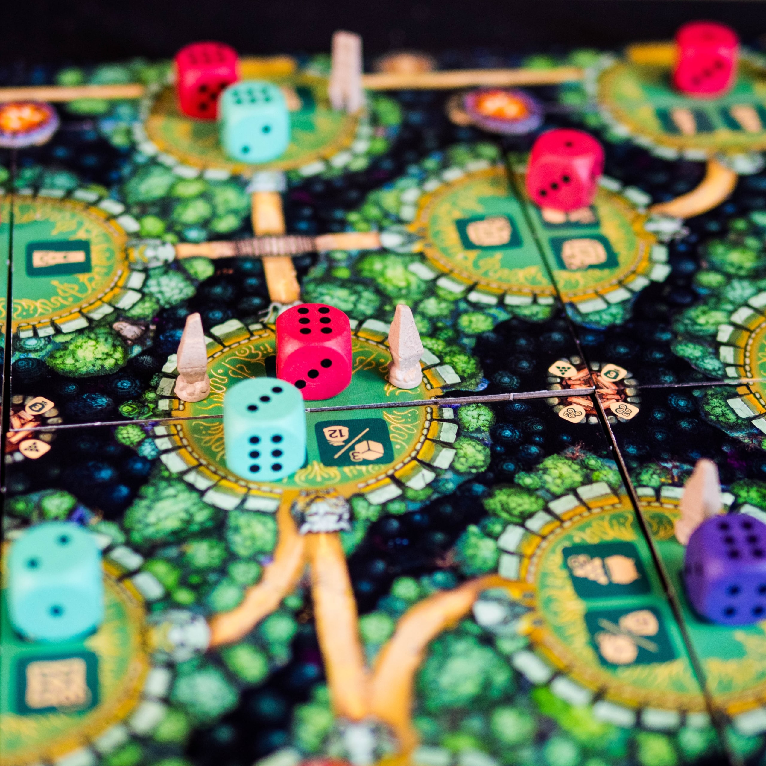 By creating an unbroken chain of dice between two dolmens of the same color, the player collects them and scores bonus points. The first three connections are even more rewarded, encouraging players to strive for these intermediate goals.