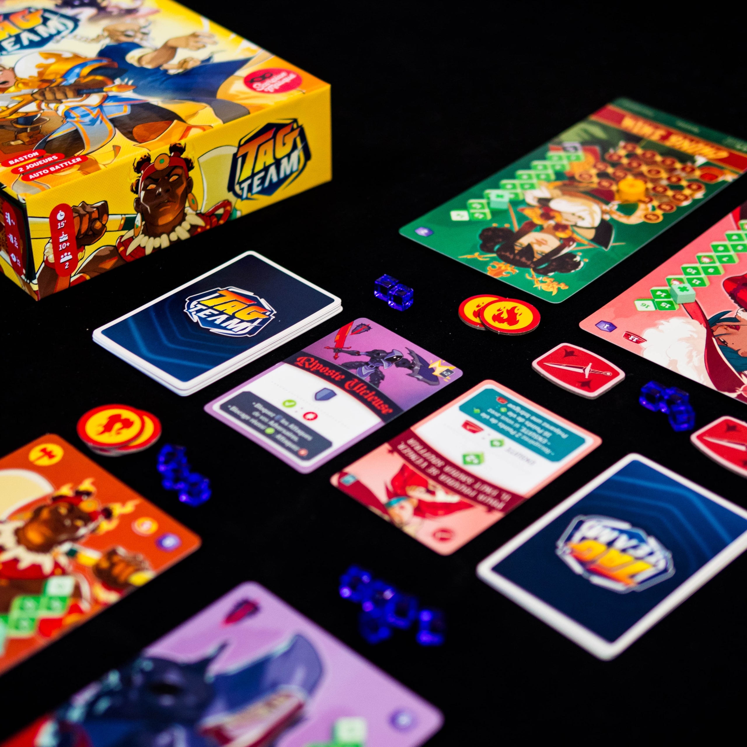 Tag Team s’impose comme un jeu de duel nerveux et accessible, pensé avant tout pour l’affrontement rapide et la rejouabilité. Les parties sont courtes, intenses, et donnent immédiatement envie d’en relancer une autre, notamment grâce aux nombreuses combinaisons de personnages possibles. Chaque duo de combattants propose des synergies uniques qu’il vous faudra expérimenter au fil de vos affrontements. Le jeu est fluide et la prise en main rapide ; un simple coup d’œil aux règles suffit pour appréhender les pouvoirs spécifiques de chaque héros.