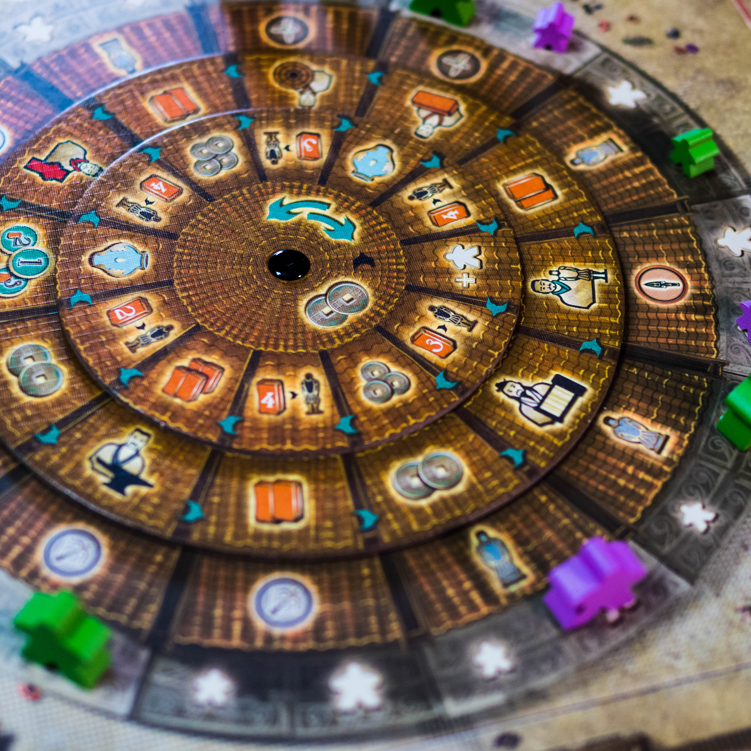Effectuer des Actions (Optionnel) : Effectuez les actions des Disques Central, Intermédiaire et Extérieur du segment où vous avez placé votre ouvrier. Les actions peuvent consister à gagner des ressources, à façonner des guerriers, à transformer des apprentis, à activer des maîtres ou à utiliser des spécialistes.